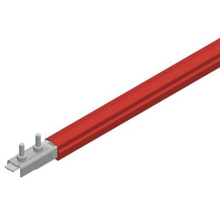 This is a galvanized steel conductor bar with a medium heat cover (red). This bar comes with a splice installed. This is a compact conductor bar that is suitable for both indoor and outdoor use.
